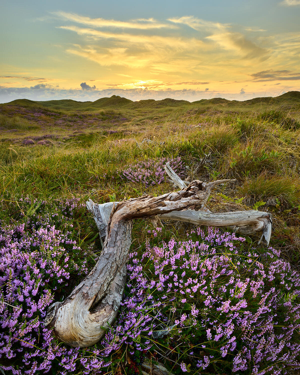 Blomstrende lyng i klitterne ved Spidsbjerg Strand, Vestjylland.